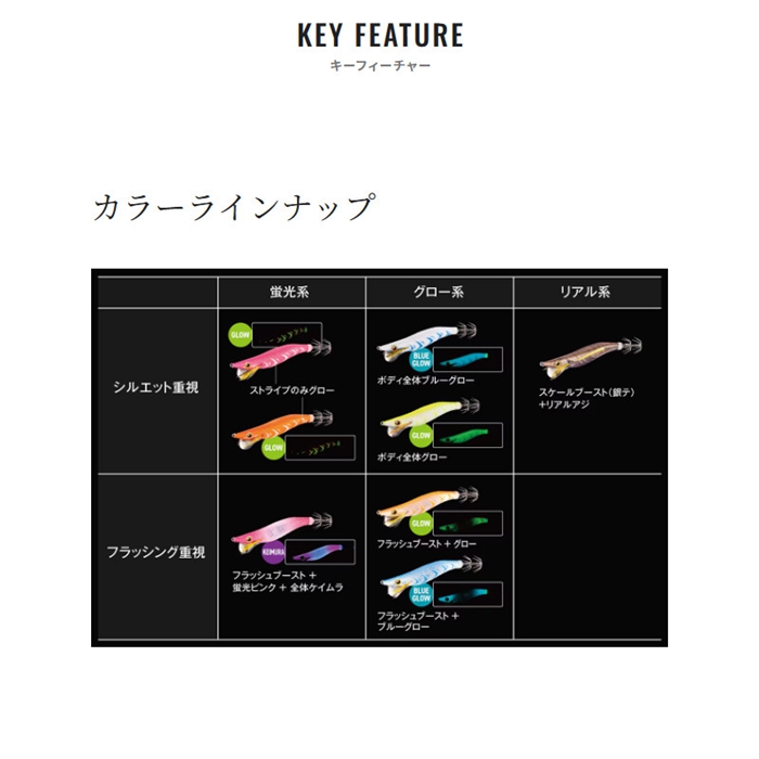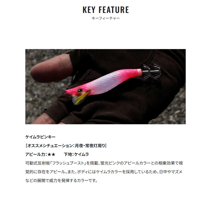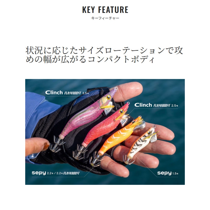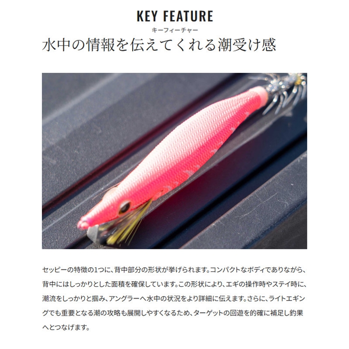近年、注目されているライトエギング。ヒイカやツツイカなどを狙う、手軽だけどゲーム性が高いこの釣りに対して、専用エギとして開発されたセッピー。その最大の特徴は、しっかりと潮の流れを掴む潮受け感です。コンパクトなボディでありながら、潮の抵抗をしっかりと受けるフラットな面を背中に採用しています。そのため、ライトエギングでは特に有効なただ巻きでも潮流をキャッチし、ターゲットを誘います。また、2.2号は2.2秒/mという速めのフォールスピードに設定されているので、より確実に底取りができるのも特徴です。さらに、このコンパクトボディにフラッシュブーストを搭載したモデルまでラインナップ。バリエーションが増えたセッピーのローテーションで、さらに広がるライトエギングの世界を楽しんで下さい。