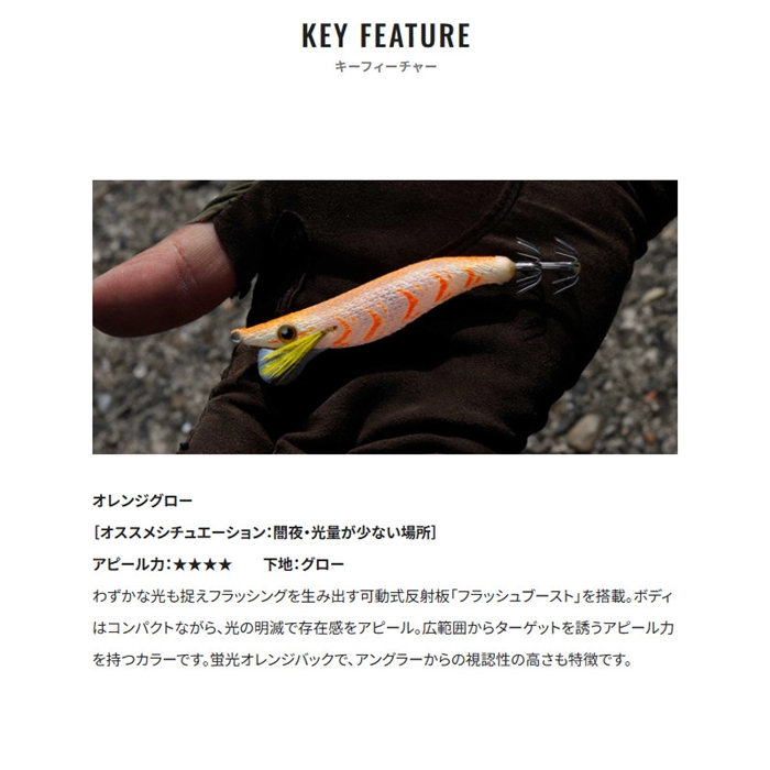 近年、注目されているライトエギング。ヒイカやツツイカなどを狙う、手軽だけどゲーム性が高いこの釣りに対して、専用エギとして開発されたセッピー。その最大の特徴は、しっかりと潮の流れを掴む潮受け感です。コンパクトなボディでありながら、潮の抵抗をしっかりと受けるフラットな面を背中に採用しています。そのため、ライトエギングでは特に有効なただ巻きでも潮流をキャッチし、ターゲットを誘います。また、2.2号は2.2秒/mという速めのフォールスピードに設定されているので、より確実に底取りができるのも特徴です。さらに、このコンパクトボディにフラッシュブーストを搭載したモデルまでラインナップ。バリエーションが増えたセッピーのローテーションで、さらに広がるライトエギングの世界を楽しんで下さい。