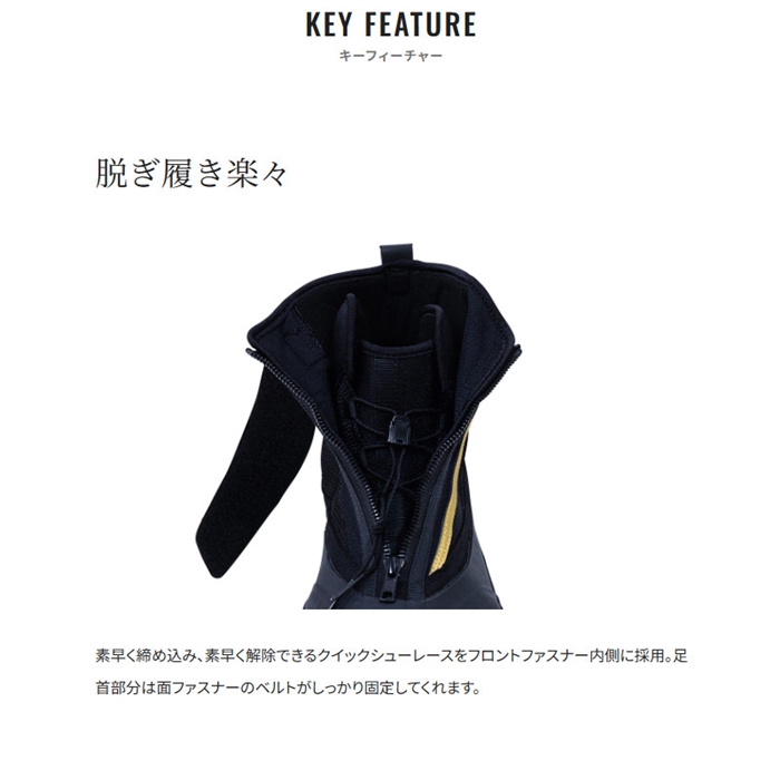 履物は軽くて耐久性があるほうがもちろん良いのですが、それを両立させるのは非常に難しいことです。このシューズは耐久性を出すためにシューズ下部にのみラバーを採用。アッパー部分には生地を採用し、必要な部分のみ補強をしています。中に入る足の保護では爪先に重点をおき、爪先周りにのみ5mm厚のクロロプレンを配置。クイックシューレースとファスナーがセンターにあり、脱ぎ履きも楽々。ソールには川での驚異的なグリップを生み出す羊毛ピンフェルトを採用。[26new04]
