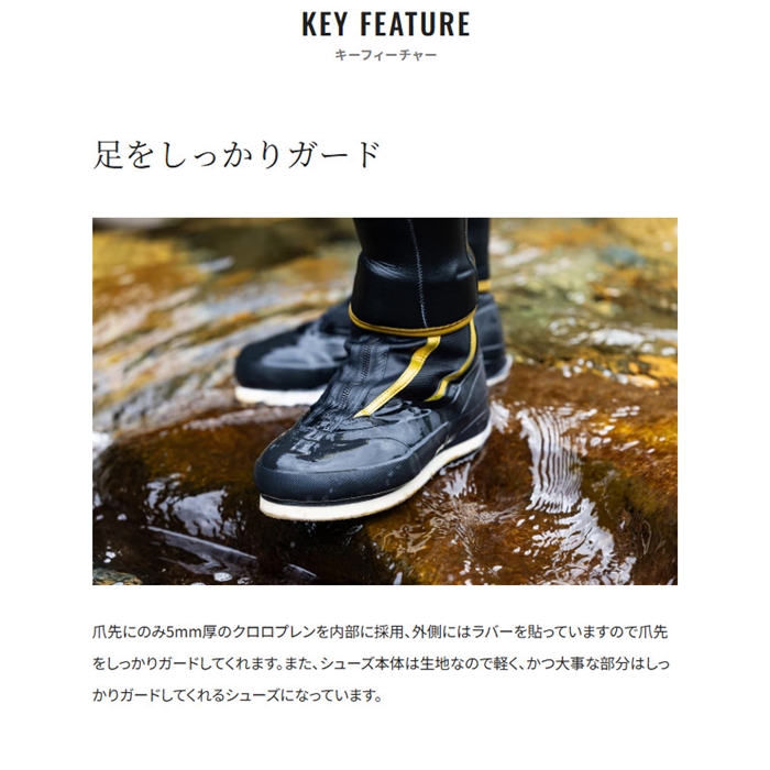 履物は軽くて耐久性があるほうがもちろん良いのですが、それを両立させるのは非常に難しいことです。このシューズは耐久性を出すためにシューズ下部にのみラバーを採用。アッパー部分には生地を採用し、必要な部分のみ補強をしています。中に入る足の保護では爪先に重点をおき、爪先周りにのみ5mm厚のクロロプレンを配置。クイックシューレースとファスナーがセンターにあり、脱ぎ履きも楽々。ソールには川での驚異的なグリップを生み出す羊毛フェルトを採用。[26new04]