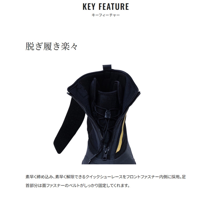 履物は軽くて耐久性があるほうがもちろん良いのですが、それを両立させるのは非常に難しいことです。このシューズは耐久性を出すためにシューズ下部にのみラバーを採用。アッパー部分には生地を採用し、必要な部分のみ補強をしています。中に入る足の保護では爪先に重点をおき、爪先周りにのみ5mm厚のクロロプレンを配置。クイックシューレースとファスナーがセンターにあり、脱ぎ履きも楽々。ソールには川での驚異的なグリップを生み出す羊毛フェルトを採用。[26new04]