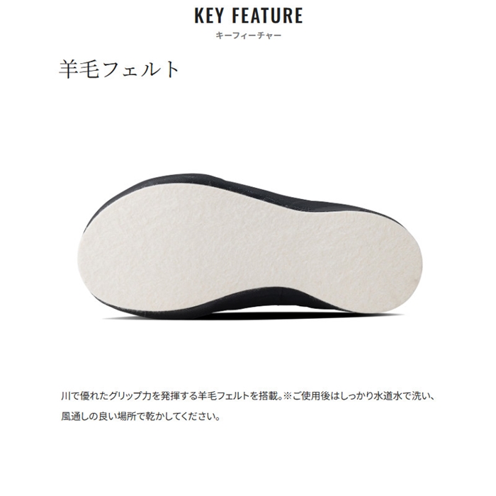 履物は軽くて耐久性があるほうがもちろん良いのですが、それを両立させるのは非常に難しいことです。このシューズは耐久性を出すためにシューズ下部にのみラバーを採用。アッパー部分には生地を採用し、必要な部分のみ補強をしています。中に入る足の保護では爪先に重点をおき、爪先周りにのみ5mm厚のクロロプレンを配置。クイックシューレースとファスナーがセンターにあり、脱ぎ履きも楽々。ソールには川での驚異的なグリップを生み出す羊毛フェルトを採用。[26new04]