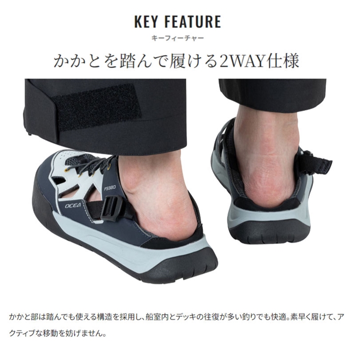 暑い季節でも集中して釣りに挑みたいオフショアアングラーに向けたサンダル。独自配合ラバーと広い接地面で優れたグリップ力を発揮し、クロマグロやGTなど大型魚とのファイトにも対応。かかとタブでフィット感を高め、踏み込めば脱ぎ履きもスムーズ。リラックス時にも快適です。立体アーチ形状のインソールが足裏をしっかり支え、長時間の釣行でも疲れにくい設計です。[26new04]