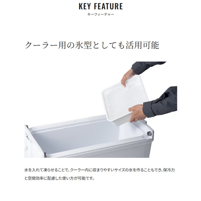 クーラー内を効率的に使える純正トレー。食料や小物を魚と分けて収納しやすく、氷に直接触れさせたくない物の収納に適しています。トレー内の物が過度に冷えにくく、釣行時の食材管理にも配慮された構造です。さらに、このトレーを型として活用すれば、クーラーボックスにぴったり収まる氷の作成にも対応。クーラー上部に自然にフィットする設計で、整理整頓と保冷効率を高めたい方に向いたアイテムです。[26new03]