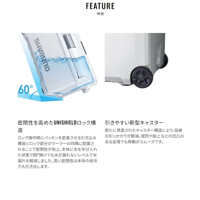 魚を持ち帰ることを考えた新定番の釣り用クーラーボックスです。20Lは内寸45cmを確保、グッドサイズの魚を折り曲げずに持ち帰ることができます。30Lは内寸55cmを確保し、尺超えの魚も折り曲げずにそのまま収納でき、キャスター付きで移動もスムーズ。独自構造「UNISHIELD」により密閉性が高く、水漏れや冷気漏れを抑えやすくなっています。両面開きの蓋は、車内や船上の限られたスペースでも開閉しやすく、ワンタッチで開く跳ね上げ式水栓は使用後の水抜きも快適。底部に水が残りにくく、洗いやすさにも配慮されています。堤防釣りからインショアボート、船エサ釣りまで幅広く対応する、頼れるクーラーボックスです。[UNIFREEZE][26new03]