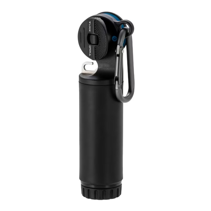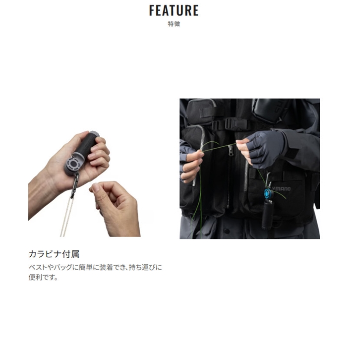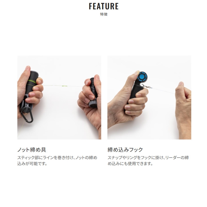 締め具とノッターを兼ね備えた便利ツール。2分割できるスティック部にラインを巻き付けることで、ノットの締め込みが可能です。ワンタッチ糸留めはラインを仮留めでき、ハーフヒッチの仕上げや、そのままFGノットの作成にも対応。さらに、リーダーにスナップやリングを結ぶ際は、金属フックに引っかけてしっかりと締め込めます。