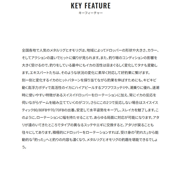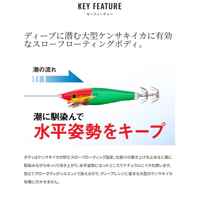 ツツイカをターゲットにしたメタルスッテゲームに欠かせない浮きスッテは、縦姿勢でステイするメタルスッテに対して潮に馴染んで横方向でイカを誘うことのできるモデル。スイスイスティック80は、浮き姿勢にこだわったスローフローティング仕様で、狙ったレンジまで仕掛けを巻き上げて止めると緩やかに浮かび上がり、水平姿勢でナチュラルにイカを誘います。シルエットをじっくり見せられることで、警戒心の高まったイカにも効果的。イカのレンジが深い日没直後や、夜焚きのアウトサイドにキャストして暗がりを探るなど、フルグローボディならではの攻略法が一歩先のゲームを可能にします。2026年、新たに富所氏徹底監修のこだわりカラーが追加になりました。[Sephia]