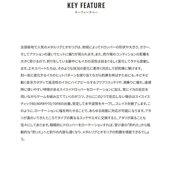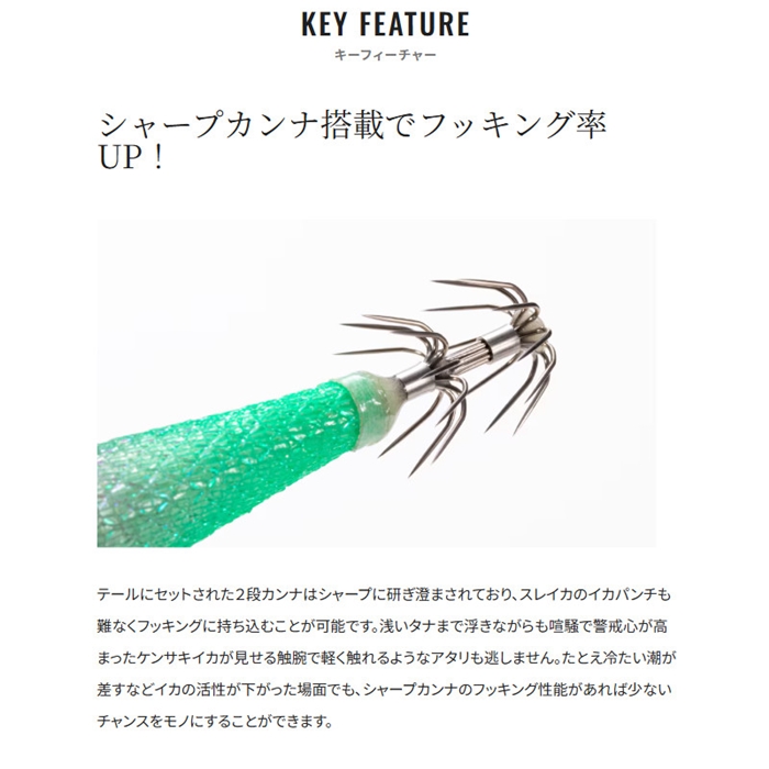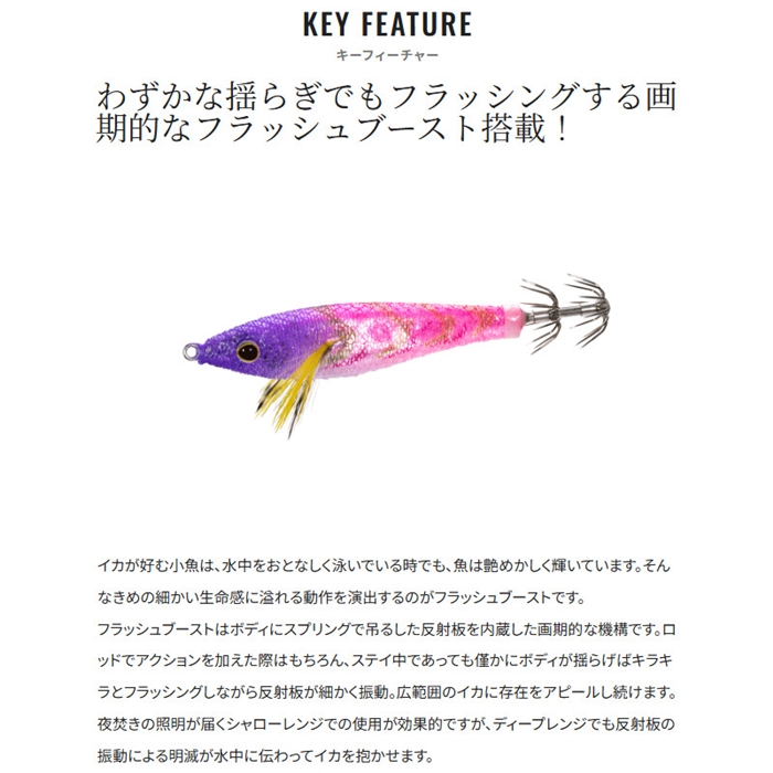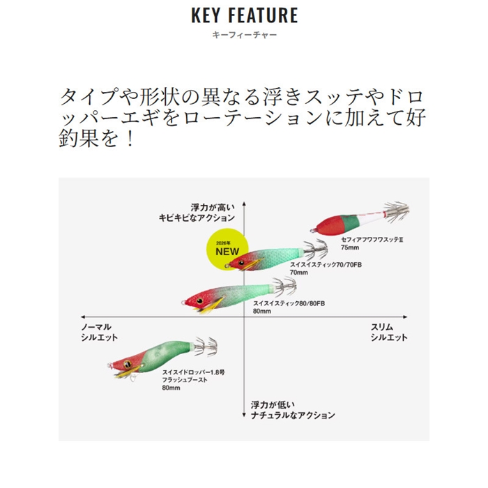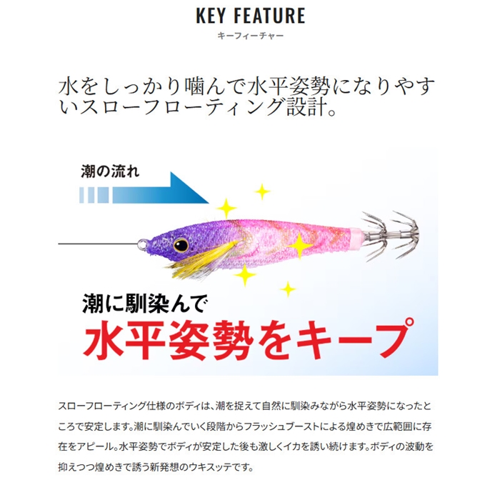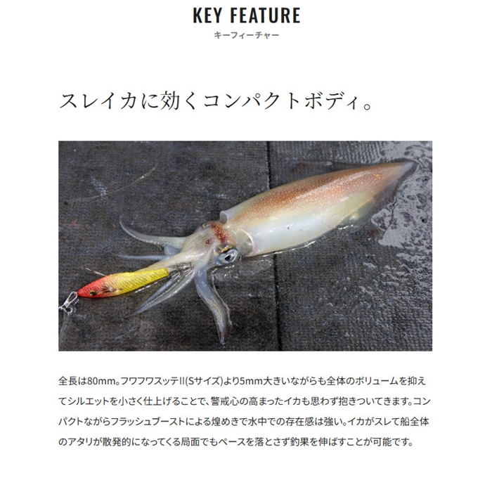 スイスイスティック80フラッシュブーストは、僅かな潮流を受けるだけでも反射板が艶やかにきらめくフラッシュブースト機構を内蔵したハイアピール浮きスッテ。潮に馴染んで水平姿勢を保ちながら、常に瞬いて激しくイカを誘います。夜焚きの明かりが届くレンジまで浮いてきた高活性のイカを次々と掛けていく、メタルスッテゲームの醍醐味ともいえるアップテンポなゲームでライバルに差をつけることが可能。スリムかつ透明感のあるクリアボディがスレたイカにも効果を発揮します。また、ボディ断面を逆三角形にデザインすることで、スッテの浮き姿勢が安定。イカの掛かりどころも安定し、バラシの軽減に貢献します。2026年、新たに富所氏徹底監修のこだわりカラーが追加になりました。[Sephia]