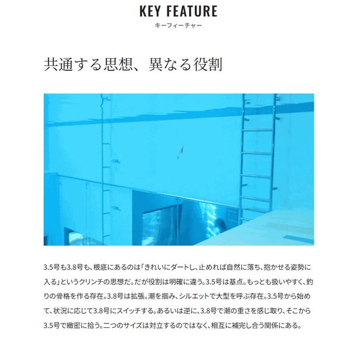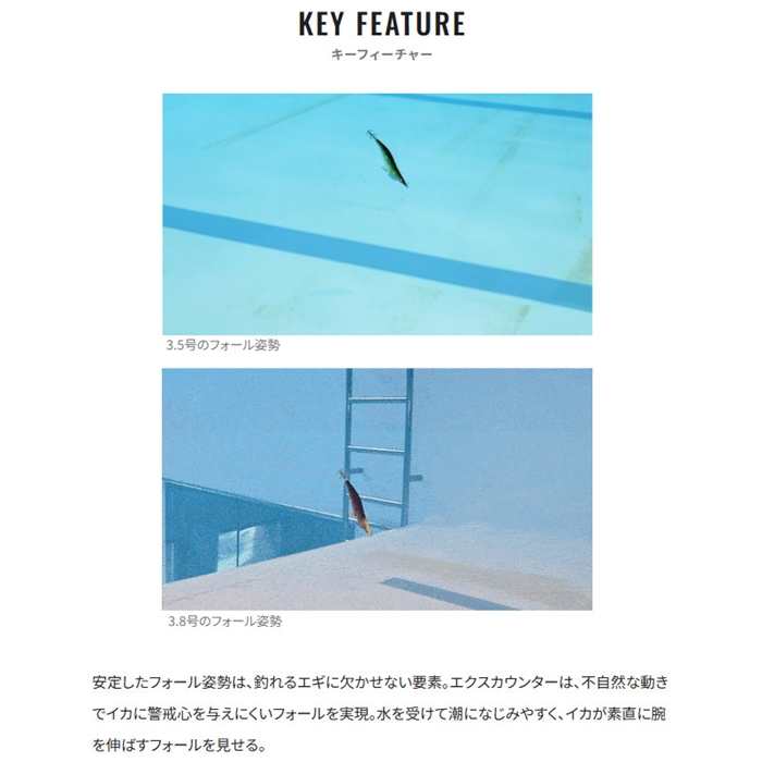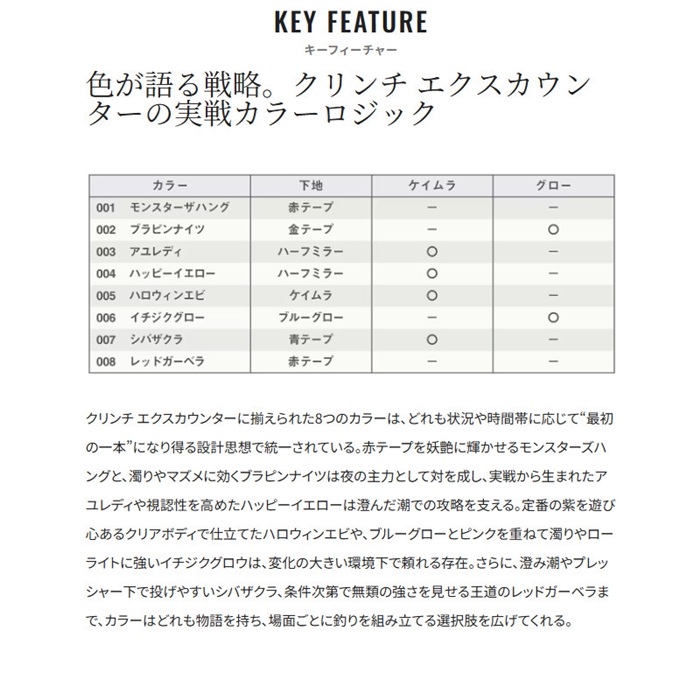 クリンチ エクスカウンターの3.5号ノーマルは一年を通してもっとも使われる基準サイズで、流れに素直に馴染み、安定したダートと自然なフォールで抱かせの間をつくり、豊富なカラーバリエーションによってデイやナイト、澄み潮から濁り潮まで幅広く対応。一方の3.8号は春から初夏にかけて接岸する大型親イカを狙うための攻略サイズで、ボリュームあるシルエットが遠くからでも強くアピールし、大型専用のカンナと潮噛みの良さによってフッキング率を高めます。秋の高活性期にも活躍し、モンスターアオリイカを仕留める力を秘める。3.5号の基点と3.8号の攻略は対立するのではなく、同じ思想で設計された補完関係にあり、状況に応じて使い分けることでエギングの幅を広げてくれるだろう。
