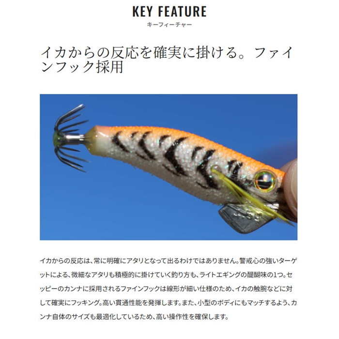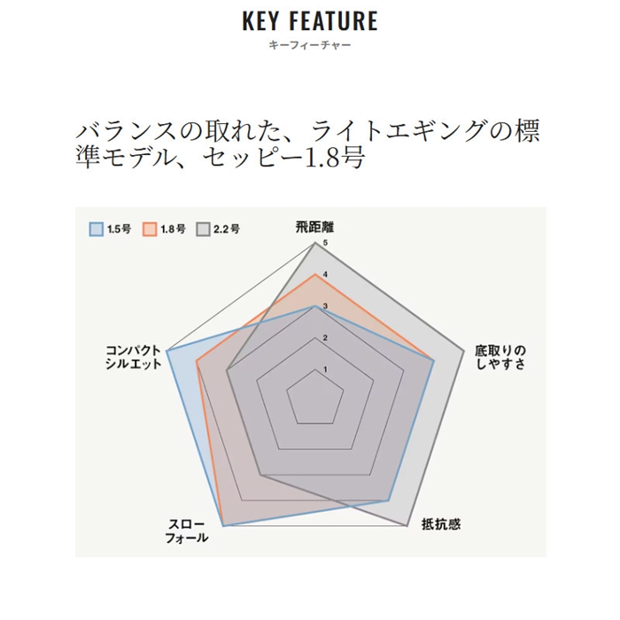 近年、注目されているライトエギング。ヒイカやツツイカなどを狙う、手軽だけどゲーム性が高いこの釣りに対して、専用エギとして開発されたセッピー。その最大の特徴は、しっかりと潮の流れを掴む潮受け感です。コンパクトなボディでありながら、潮の抵抗をしっかりと受けるフラットな面を背中に採用しています。そのため、ライトエギングでは特に有効なただ巻きでも潮流をキャッチし、ターゲットを誘います。また、2.2号は2.2秒/mという速めのフォールスピードに設定されているので、より確実に底取りができるのも特徴です。さらに、このコンパクトボディにフラッシュブーストを搭載したモデルまでラインナップ。バリエーションが増えたセッピーのローテーションで、さらに広がるライトエギングの世界を楽しんで下さい。