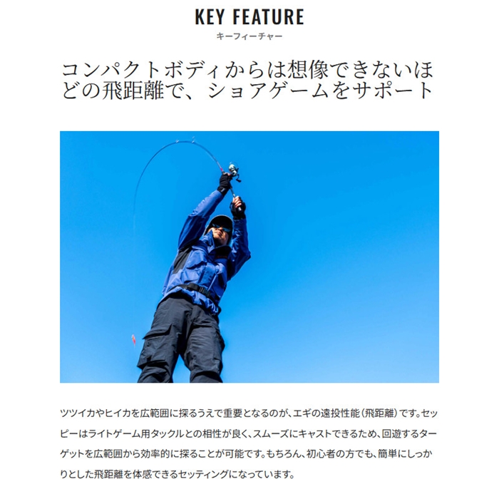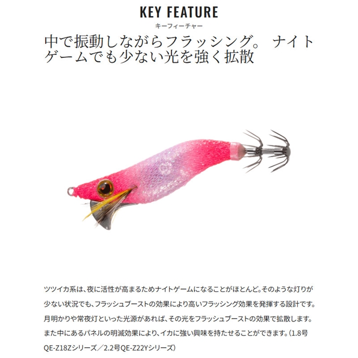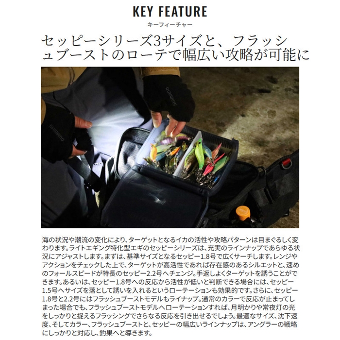 近年、注目されているライトエギング。ヒイカやツツイカなどを狙う、手軽だけどゲーム性が高いこの釣りに対して、専用エギとして開発されたセッピー。その最大の特徴は、しっかりと潮の流れを掴む潮受け感です。コンパクトなボディでありながら、潮の抵抗をしっかりと受けるフラットな面を背中に採用しています。そのため、ライトエギングでは特に有効なただ巻きでも潮流をキャッチし、ターゲットを誘います。また、2.2号は2.2秒/mという速めのフォールスピードに設定されているので、より確実に底取りができるのも特徴です。さらに、このコンパクトボディにフラッシュブーストを搭載したモデルまでラインナップ。バリエーションが増えたセッピーのローテーションで、さらに広がるライトエギングの世界を楽しんで下さい。