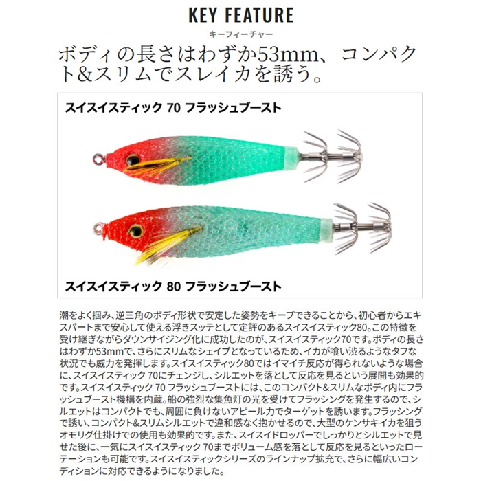 ターゲットとなるイカの活性が上がりきらない、大きいサイズのスッテに反応が悪い、そのような状況で威力を発揮するのが、スイスイスティック 70 フラッシュブーストです。スイスイスティック 80で評価の高い潮馴染の良さや水平姿勢はそのままに、シルエットをひと回り落とすことで、セレクティブなイカに対して効果的にアプローチできるよう設計されています。また、スイスイスティック 70 フラッシュブーストのラインアイにはスイベルが採用されているので、潮流に対してナチュラルに漂いながら安定した姿勢をキープします。スリムなボディシェイプとの相乗効果で、警戒心の強いスレたイカも思わずバイトする仕様となっています。ナチュラルな誘いを得意とする一方で、ロッドワークで積極的に誘うような展開でも、ハイレスポンス設計により、アングラーの意図を忠実に反映し、さらに、このコンパクトなボディの中にフラッシュブーストを搭載することで、シルエットは小さくても、フラッシングでしっかりとアピールすることが可能となっています。基本となるメタルスッテ仕掛けから、人気のオモリグ仕掛けまで幅広く対応するため、周りに差をつける切り札として持っておくことで、ローテーションの幅が確実に広がる浮きスッテとなっています。[Sephia SUI SUI STICK 70 FLASHBOOST]