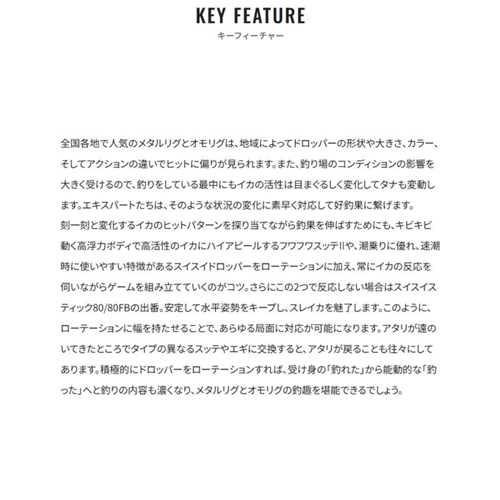 ターゲットとなるイカの活性が上がりきらない、大きいサイズのスッテに反応が悪い、そのような状況で威力を発揮するのが、スイスイスティック 70 フラッシュブーストです。スイスイスティック 80で評価の高い潮馴染の良さや水平姿勢はそのままに、シルエットをひと回り落とすことで、セレクティブなイカに対して効果的にアプローチできるよう設計されています。また、スイスイスティック 70 フラッシュブーストのラインアイにはスイベルが採用されているので、潮流に対してナチュラルに漂いながら安定した姿勢をキープします。スリムなボディシェイプとの相乗効果で、警戒心の強いスレたイカも思わずバイトする仕様となっています。ナチュラルな誘いを得意とする一方で、ロッドワークで積極的に誘うような展開でも、ハイレスポンス設計により、アングラーの意図を忠実に反映し、さらに、このコンパクトなボディの中にフラッシュブーストを搭載することで、シルエットは小さくても、フラッシングでしっかりとアピールすることが可能となっています。基本となるメタルスッテ仕掛けから、人気のオモリグ仕掛けまで幅広く対応するため、周りに差をつける切り札として持っておくことで、ローテーションの幅が確実に広がる浮きスッテとなっています。[Sephia SUI SUI STICK 70 FLASHBOOST]