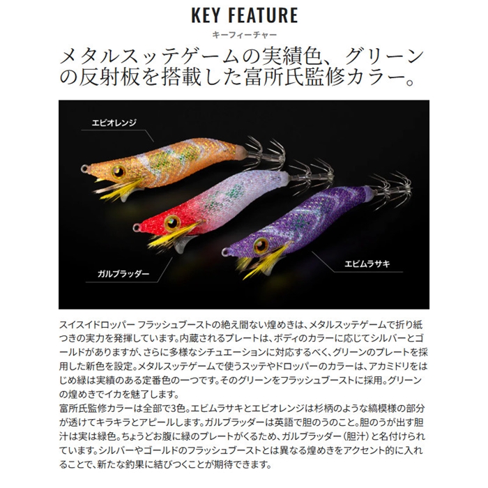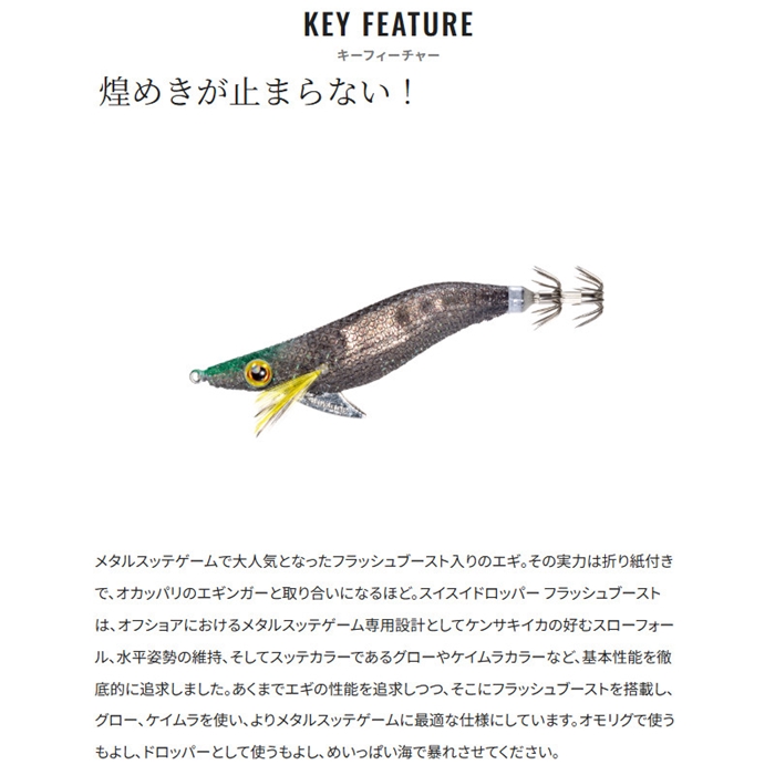 潮に馴染みやすい浮力設定により、速い潮流の中でもナチュラルにイカを誘う水平姿勢をキープできる設計です。さらにスローフォールにより、イカがしっかり抱く時間を確保。この効果はイカがスレてしまった状況にも有効です。フォール中もキラキラとアピールを続けるフラッシュブーストを搭載し、目で見て抱いてくるイカの好奇心を引き続けます。2026年、新たに富所氏徹底監修のこだわりカラーが追加になりました。[Sephia][FLASHBOOST]