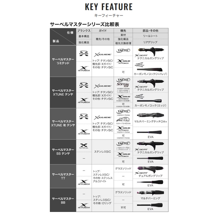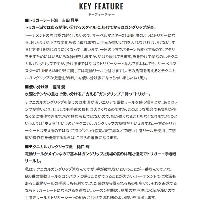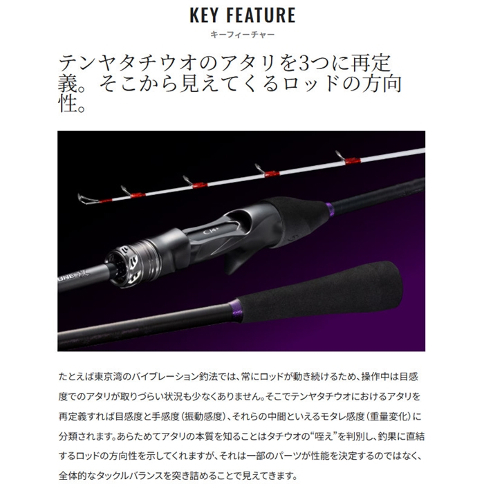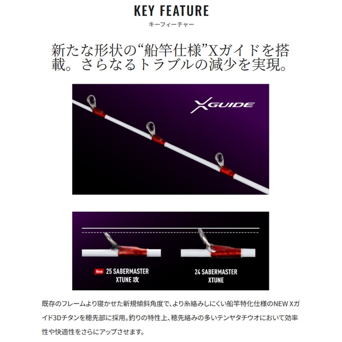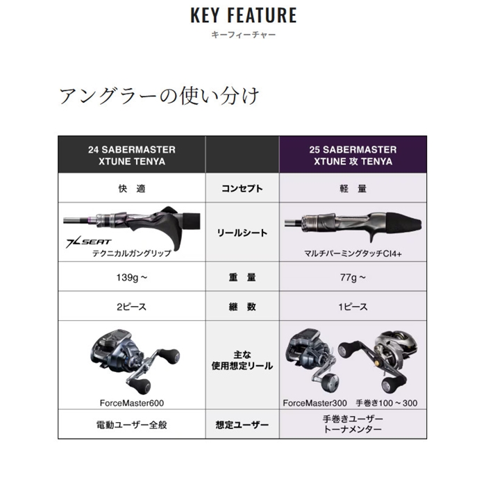関西のトーナメントシーンや関東のバイブレーション釣法を改めて見つめなおした際に浮き出た疑問。それは果たして全ての釣り人が快適さを求めているのかということ。先行モデルと本製品とのコンセプトの違いは、快適性をとるか軽量性をとるかにある。快適性を求めた「サーベルマスターXTUNE テンヤ」と軽量性を求めた「サーベルマスターXTUNE 攻テンヤ」の決定的な違いはリールシートにある。[SABERMASTER XTUNE SEME TENYA][26new01]