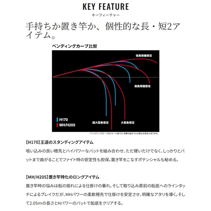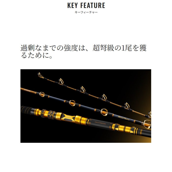 唯一無二の超高強度を追求した新生ビーストマスター。しかし、大物竿において『強い』ことはスタートラインに過ぎない。しなやかに追従するかのように曲がるグラスソリッド特有の粘り強さはそのままに、ハイパワーXフルソリッド構造を施すことで本体ブランクスを強化。グラス素材特有のネジレによるブレやパワーロスを抑え、快適なロッドワークを追求。穂先は活餌の微細な動きを捉え興奮の瞬間を彩り、ベリーは本命のアタリを逃さずしなやかに追従、そしてバット部には獲物の最後の抵抗を封じ込めるパワーを…。大型魚との真剣勝負に、妥協は許されない。そしてただ強いだけでは夢は掴めない。どんな魚にも、どんな状況にも、手加減なしで挑める安心感。「ビーストマスター」は記録を塗り替えるための『本気』に応える。[BEASTMASTER OYOGASE][26new01]