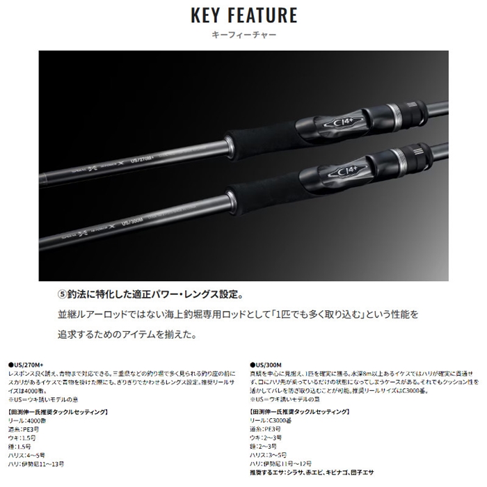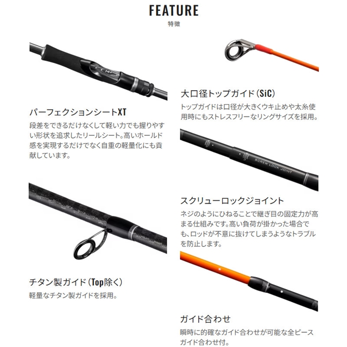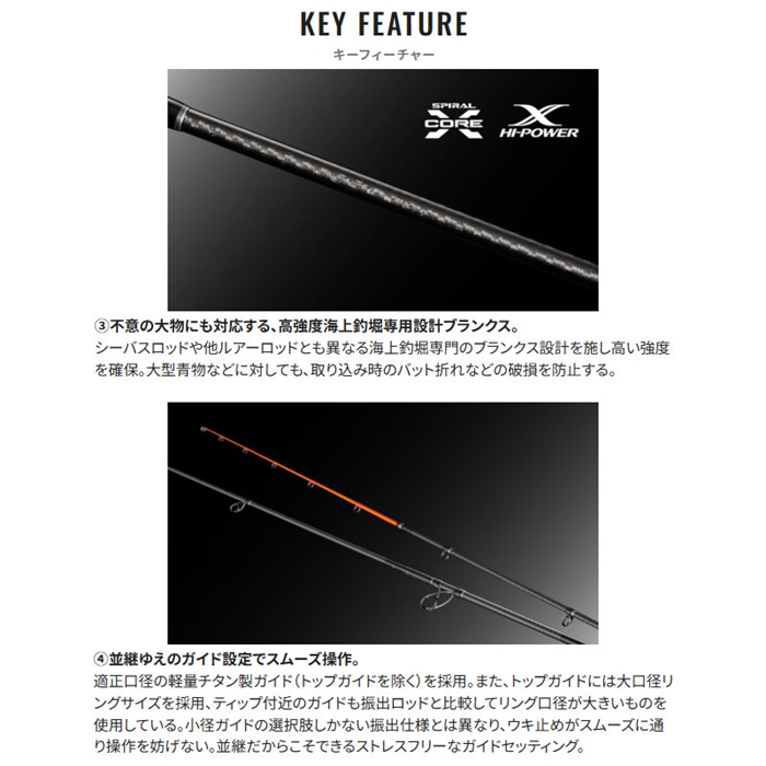 ウキを用いた誘い釣法の最適解を追求。コンセプトにしたのは軽量設計で長時間の手持ち操作でも疲労を軽減し、喰わせるための繊細な操作性。ティップ部はオレンジ塗装のカーボンソリッド タフテック∞が、アタリに対する手感度と目感度を両立。リールシートには段差レス構造のパーフェクションシートXTを採用し、握りやすく、操作性をアシストします。リールシート長は多様な操作・ファイトスタイルに対応するレングス設定。高強度ブランクスにはスパイラルXコア、ハイパワーXを採用し、青物との高負荷なやり取りにも粘り強く対応。ガイドセッティングは道糸の出し入れが激しい状況でもウキ止めが引っ掛からないトラブルレス性能を確保し、狙い通りに喰わせ、確実に獲る。釣れるという確信が、貴重な1尾との出会いを導きます。[SEAREA XTUNE][26new01]