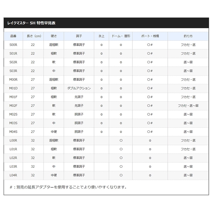 繊細なアタリを捉える感度と対応力を誇るワイドバリエーション。さまざまな状況をシステマティックに釣りこなす!「レイクマスターSH」は16種類の構成からなるシステマティックな穂先。千差万別のフィールド環境や季節、天候といった状況をはじめ、使用する仕掛け、釣れるワカサギのサイズや活性などに合わせて、ベストな長さと調子をセレクトできます。緻密に削り出した扁平波形グラスソリッドはアイテムごとの調子をリアルに表現。薄膜軽量塗装、そして3色のコントラストで視認性を高めたカラーリングによって、繊細なワカサギのアタリを明確にキャッチすることができます。臨機応変、変幻自在。多彩な攻めを可能にするNEWベーシック穂先の誕生です。[LAKE MASTER SH]
