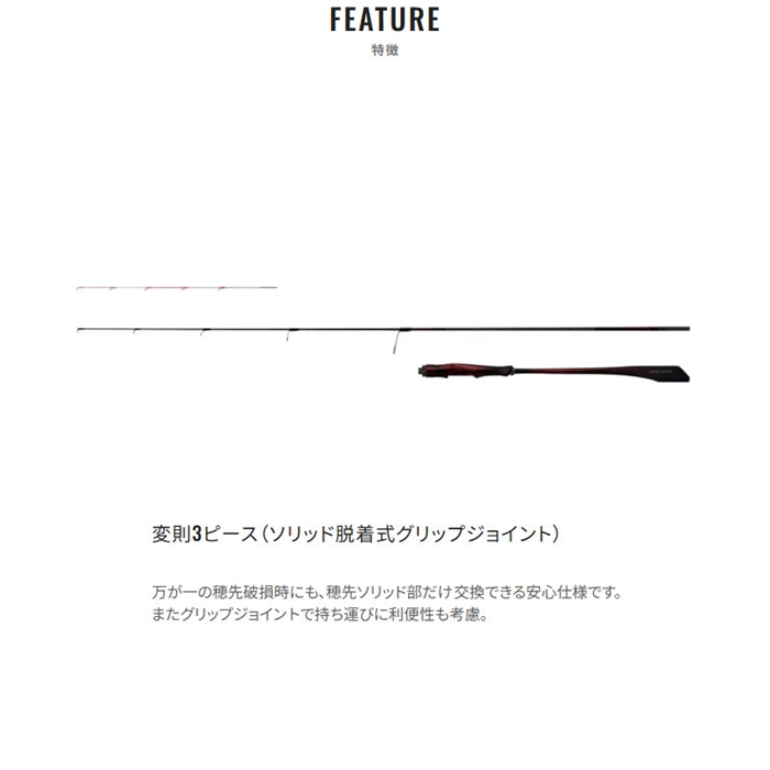 セフィアリミテッドに満を持して3つの調子が登場。タフテック∞を採用した王道のメタルスッテ調子「F(ファストテーパー)」、ハイレスポンスソリッドを採用したオモリグ対応調子「R(レギュラーテーパー)」そして愛称 ウキウキトップ(グラスソリッド)搭載の「UKモデル」。3調子ともに軽くて強い基本構造スパイラルXコアと高弾性素材による細身ブランクスを実現。スリムでありながら大剣にも物おじしないパワーも魅力。ベイトモデルにはXシートフロントトリガーを採用し、手の部位で最も繊細な指先でトリガーを保持することで、指揮棒感覚の操作性を実現。操作時、ファイト時、持ち方を工夫することでその威力を発揮します。[25new01]
