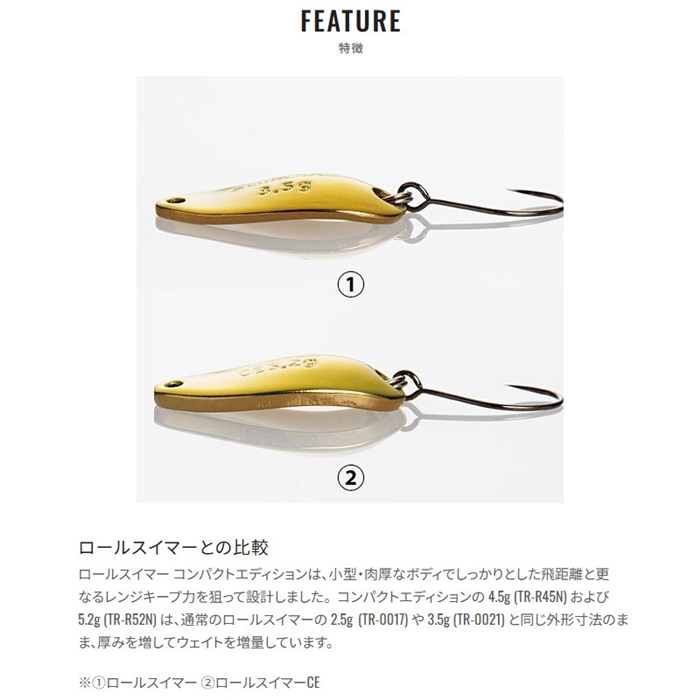 従来のロールスイマーに比べて一回り小さいシルエット。ロールスイマー拘りの水を噛む部分を多くしたボディデザインはそのままに、本体を肉厚化することで飛距離の向上とボトムレンジをさらに安定して泳がせる効果を狙った設計です。