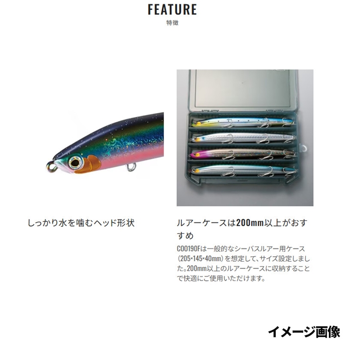 COOは水深10cmのレンジを狙って開発された、水面直下特化型ルアー。シンペンの様な泳ぎなのに、フローティングで浮く。だから、シーバスが下からしっかりルアーを見上げて認識します。シーバスがCOOを見て、エサとして認識し、そして喰いに来る。そのチャンスを増やすためには、まず見せることが最も重要。バチ、ボラ、コノシロ、サヨリにハタハタまで。このサイズだからこそ開けるあらたな世界を体感してください。