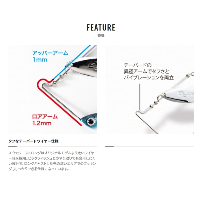 ディープレンジを攻略するヘビーデューティーモデル!スウェジーストロングはテーパードワイヤーを採用することでタフさとバイブレーションの伝達向上を両立しています。ロアアームは線径を太くすることでフッキング時の伸びを抑えフッキング率を向上させています。アッパーアームはブレードの振動をロッドに伝えやすい線径に設計されています。[Bantam Swagy Strong]