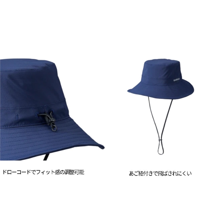 シマノ独自の防水透湿基準ドライシールド+に適合した雨天に強いハットです。あごひも付き&ドローコードによるフィット感の調整が可能で風のある日にも安心。ウェアと合わせやすいベーシックなシルエット&デザインです。[22new04]