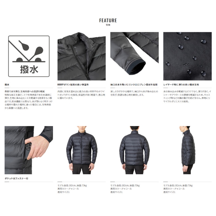 ミドルレイヤードで必要とされる保温性を追求したダウンジャケットです。嵩高の高い800FP高品質ダウンを使用しており、暖かな着心地とコンパクトにたたんでしまえる収納性が特長。さらに、重ね着しても動きやすいように適材適所なダウン量の配置設計です。軽量で滑りの良い撥水生地や水を吸い上げにくいクロロプレン仕様の袖口などがアングラーをサポートします。[22new04]