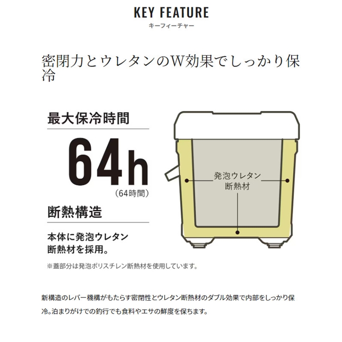 「保冷力」「密閉性」「剛性感」を兼ね備えたユーティリティモデルです。新構造のレバー機構による高い密閉性は上級機種と同等。移動時も冷気漏れや水漏れを軽減し、保冷性能を損ねません。断熱材には保冷力と軽さを兼ね備えたウレタンを採用し、港での持ち運びや船での受け渡しも楽々です。[23new03]
