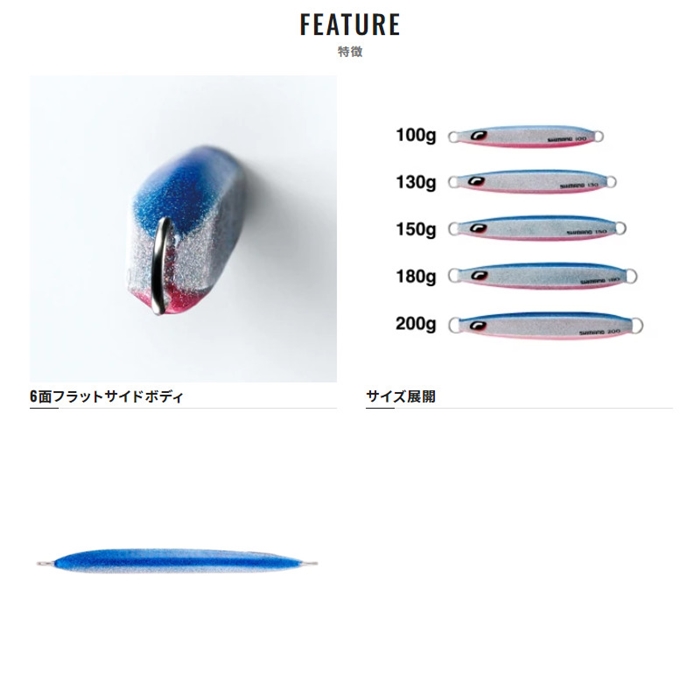 オシアシックスサイドは速いフォールのリアクションで魚を反応させ、中層を効率的に探ることに特化。スムーズな水の受け流しを意識した6:4リアバランスのコンパクトボディで、ジャークでは速やかに横を向き、短くスライド。一瞬フリーズして水平姿勢で喰わせの間を演出しつつ、バタツキや横移動を抑えて速やかにフォールに移行。乗合船で扱いやすい素直な沈下軌道で、シビアにタナを刻むタチウオなどにオススメ。SCALE BOOSTの明滅を活かす6面構成ボディは、小さなアクションでもしっかりとアピール。タチウオだけでなく、サクラマスも意識したカラーラインナップを採用。[23new16]