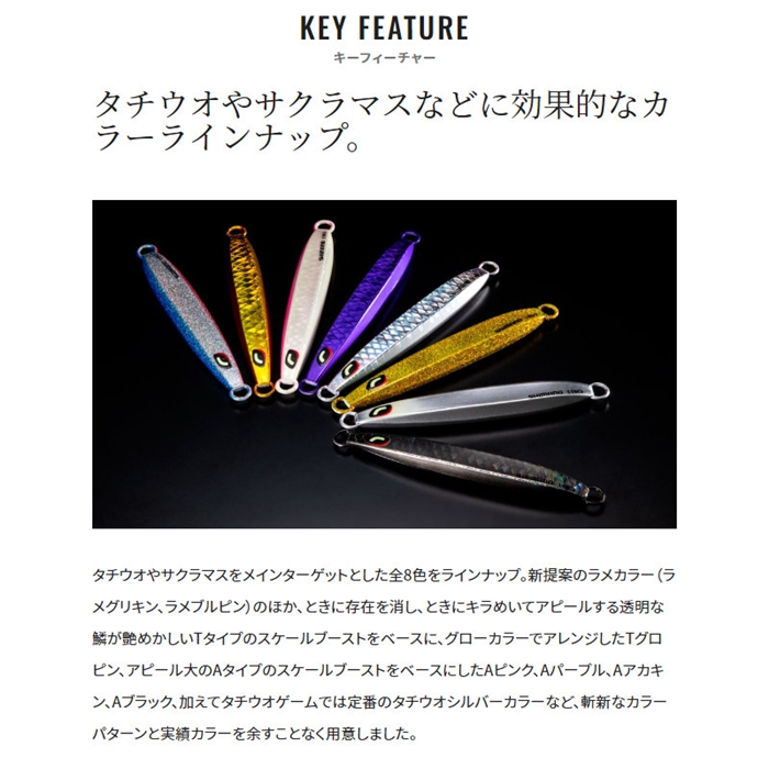 オシアシックスサイドは速いフォールのリアクションで魚を反応させ、中層を効率的に探ることに特化。スムーズな水の受け流しを意識した6:4リアバランスのコンパクトボディで、ジャークでは速やかに横を向き、短くスライド。一瞬フリーズして水平姿勢で喰わせの間を演出しつつ、バタツキや横移動を抑えて速やかにフォールに移行。乗合船で扱いやすい素直な沈下軌道で、シビアにタナを刻むタチウオなどにオススメ。SCALE BOOSTの明滅を活かす6面構成ボディは、小さなアクションでもしっかりとアピール。タチウオだけでなく、サクラマスも意識したカラーラインナップを採用。[23new16]