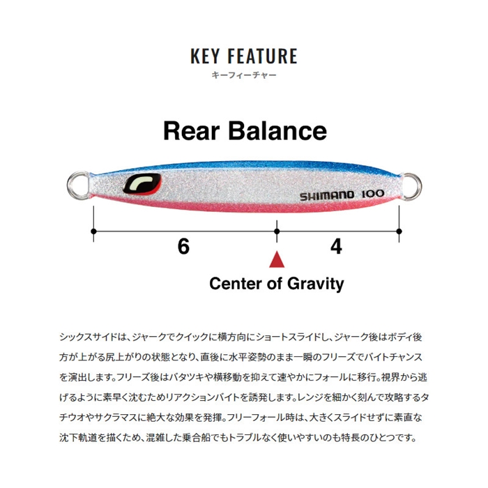 オシアシックスサイドは速いフォールのリアクションで魚を反応させ、中層を効率的に探ることに特化。スムーズな水の受け流しを意識した6:4リアバランスのコンパクトボディで、ジャークでは速やかに横を向き、短くスライド。一瞬フリーズして水平姿勢で喰わせの間を演出しつつ、バタツキや横移動を抑えて速やかにフォールに移行。乗合船で扱いやすい素直な沈下軌道で、シビアにタナを刻むタチウオなどにオススメ。SCALE BOOSTの明滅を活かす6面構成ボディは、小さなアクションでもしっかりとアピール。タチウオだけでなく、サクラマスも意識したカラーラインナップを採用。[23new16]