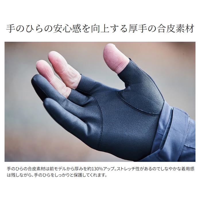 保温性のあるタイタニューム・アルファに加え、手のひらには操作性だけでなく過酷な環境での使用を想定した耐久性を獲得するために合皮素材を採用。手のひら部分の合皮革を従来品と比べ厚くすることで安心感が向上しました。手首まで覆うロング仕様で防寒性にも優れています。保温性と操作性のバランスに優れる3本指ぬき仕様です。[23new04]