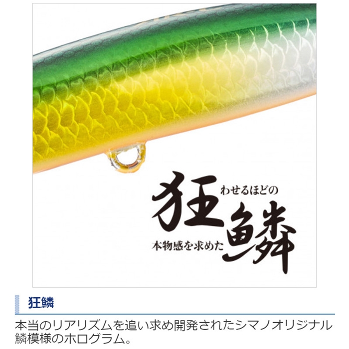 ヘッドリップでS字スラローム!スライドアサシンに狂鱗カラーが追加!アピール力にこだわった、ワイドなS字スラロームアクションと低速での立ち上がり性能をヘッドリップ構造で両立させる設計のスライドアサシンは、スイム姿勢もフォール時の姿勢もほぼ水平を狙って調整しており、シーバスだけでなくヒラスズキにもオススメなサーチベイトです。貫通ワイヤー構造を採用し、ST-56やSTX-58の#4といった太軸フックにも対応。AR-C重心移動システムによる安定した飛行性能も魅力です。[EXSENCE Slide Assassin 100S X AR-C]