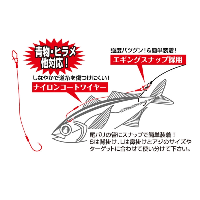 【カツイチ/KATSUICHI】魚も獲れーる、ヤエン釣りで高級魚をゲット!アオリイカ狙いのヤエン釣りやウキ仕掛などで、青物やヒラメといった嬉しい外道の反応がある場合は要チェック!スナップ付きなので尾バリの管へワンタッチでセット!備えておくことで本命以外のお土産をゲットできます。ナイロンコートワイヤー#48、Vスナップ採用