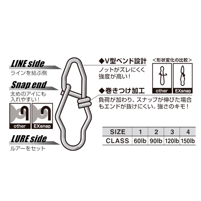 【カツイチ/KATSUICHI】強度の高いハイグレードSUSワイヤーをV型形状に、そしてエンド部分に巻き付け加工を施し、過剰な力が加わった際には全体が伸び、抜けや破断といった最悪の事態を回避する設計の高耐久スナップです。ショアからの様々なソルトウォーターターゲットはもちろん、エクスペディションでの淡水モンスター狙い等にも最適。[EX Snap]