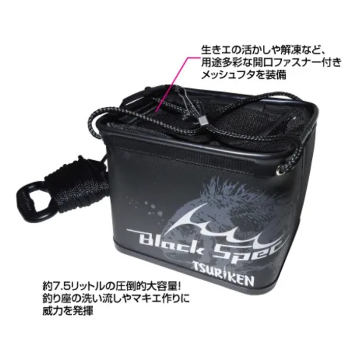【釣研/Tsuriken】チヌ師のこだわりを随所に取り入れた使い勝手のよいバケツ。約7.5リットルの圧倒的大容量!釣り座の洗い流しやマキエ作りに威力を発揮。生きエの活かしや解凍など、用途多彩な開口ファスナー付きメッシュフタを装備[TSURIKEN]