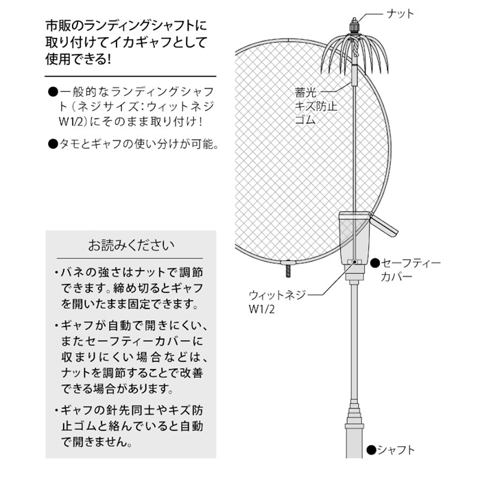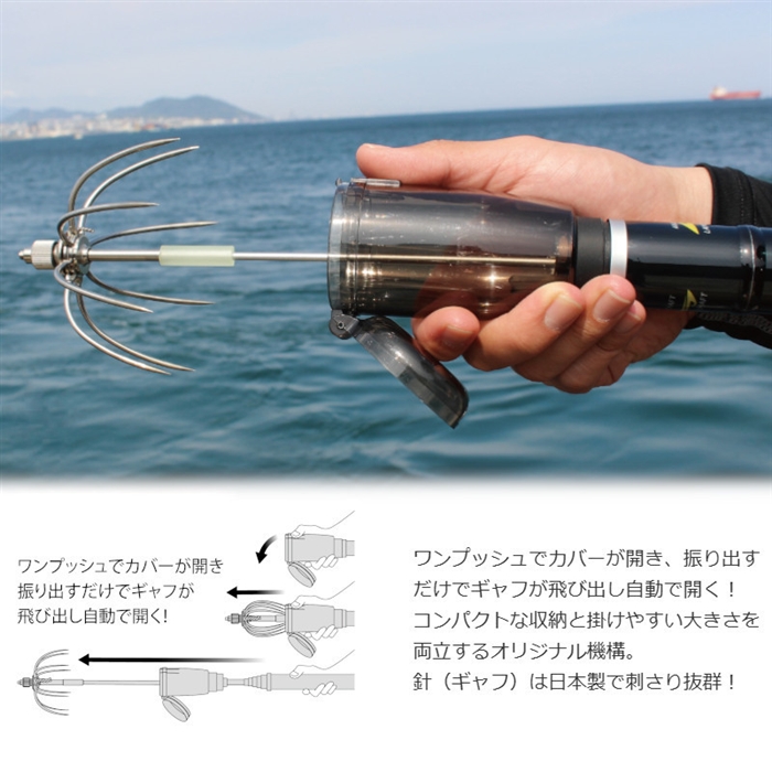 【第一精工/DAIICHISEIKO】コンパクトシャフトに対応した「SS」サイズを新たに加え、セーフティーカバーの開閉はリング式からワンプッシュオープン式に変更し安全性と利便性の両方を高めました。ソリッドのカラーもシルバーにすることで夜間でも視認性がUP!また、太針タイプのギャフ部ワイヤー線形をΦ1.0mm(従来品)→Φ1.2mmにすることで耐久性をより高めました。