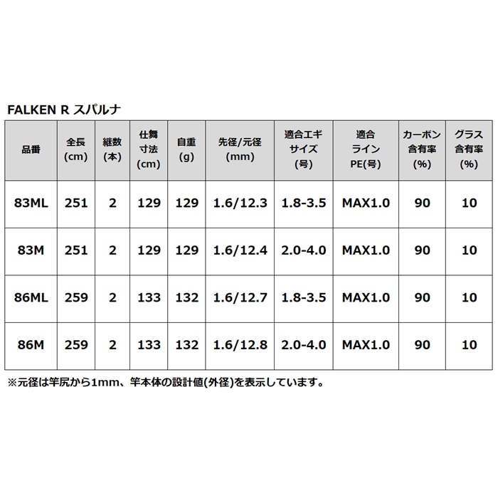 【注意事項】 ※元径は竿尻から1mm、竿本体の設計値(外径)を表示しています。