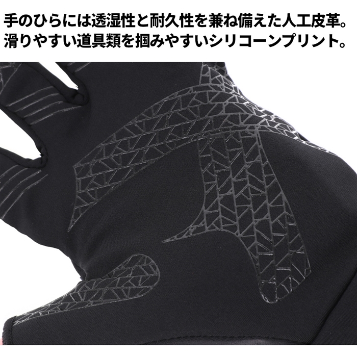 シンプルなデザインで釣りシーンもオシャレに。風を通さない三層構造でシンプルなプリント生地/防風フィルム/フリース。パターンを改良しフィット感をアップ!メイン生地はTPUコーティングでハリを通しにくく、ストレッチの効いたマチで動きやすい。手のひら側には強度・透湿性のある合皮生地を採用。[エックス・オー・エックス][22new04]