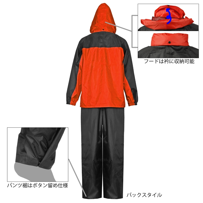 シンプルなデザインのベーシックレインスーツ。縫製部分全てにシームシーリング加工(防水加工)、表面に撥水加工を施し、雨水の浸入を防ぎます。また耐水圧6000mm(一般的な傘は耐水圧500mm)の生地を採用、機能面も充実の一着です。