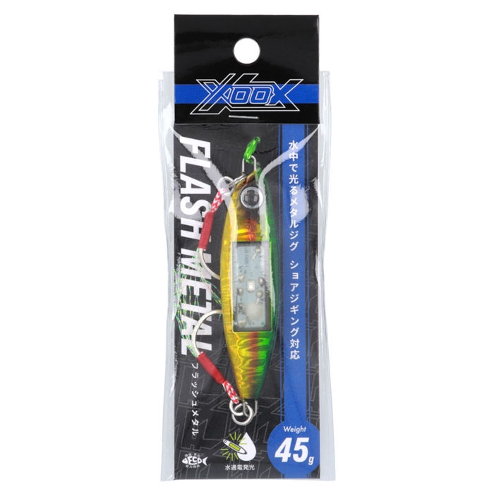 水中通電式で、水に入れるとライトが点滅する「光るメタルジグ」。ライトショアジギングに特化したひとくちサイズのコンパクトタイプ。フロントとリアにシングルフックを装着し、ジャークからリトリーブまで、様々なアクションに対応。青物はもちろん、根魚やフラットフィッシュ、シーバスなど多くのフィッシュイーターがターゲット。ショアだけでなく、オフショアにて浅場でのスーパーライトジギング(SLJ)にもおすすめ。[TG-6010][FLASH METAL][エックス・オー・エックス][24new16]