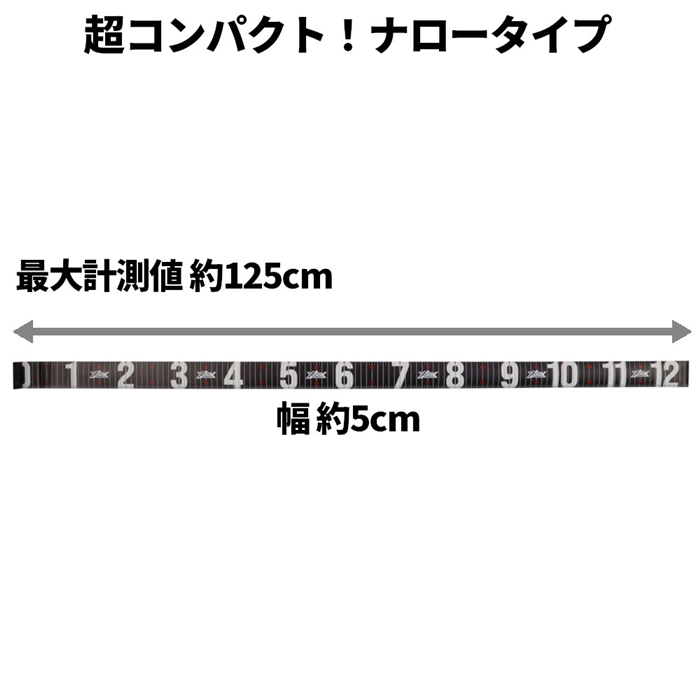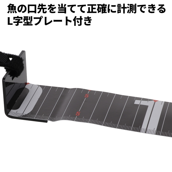ポケットに入る小型仕様。幅5cmのナロータイプのメジャー。魚の口先を当てて正確に計測できるL字型プレート付き。丸洗い可能なPVC素材を採用。[FISHING MEASURE NARROW type][CM-647][エックス・オー・エックス]