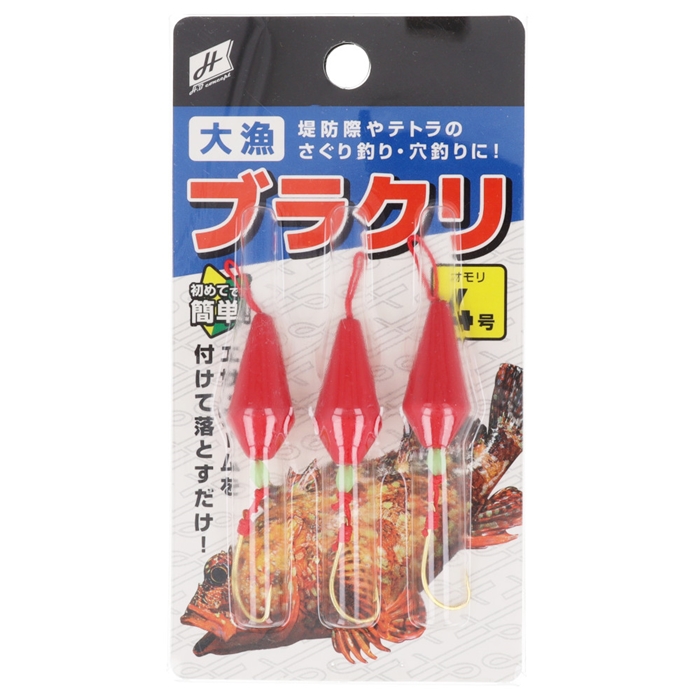 小さな穴やテトラの隙間も攻めやすいスリム形状のブラクリ。カサゴ、アイナメ、ソイ、メバルなどの穴釣りにおすすめ。穴の中に落としたブラクリを見つけやすい赤色のボディに、集魚力の高い夜光玉を装着。虫エサから魚の切り身、オキアミなどにも最適な丸セイゴバリを採用。