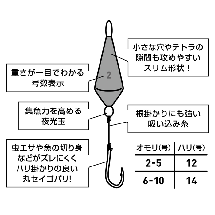 小さな穴やテトラの隙間も攻めやすいスリム形状のブラクリ。カサゴ、アイナメ、ソイ、メバルなどの穴釣りにおすすめ。穴の中に落としたブラクリを見つけやすい赤色のボディに、集魚力の高い夜光玉を装着。虫エサから魚の切り身、オキアミなどにも最適な丸セイゴバリを採用。