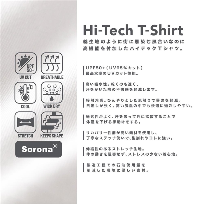 綿生地のように肌触りが良く街に馴染む風合いなのに高機能を付加したハイテックTシャツ。最高水準のUVカット性能UPF50+(UV95%カット)高い吸水性で、乾くのも早く汗をかいた際の不快感を軽減します。接触冷感でひんやりとした肌触りで暑さを軽減。通気性がよく汗を吸って外に拡散することで体温を下げる手助けをします。[ID-3001][25new04]